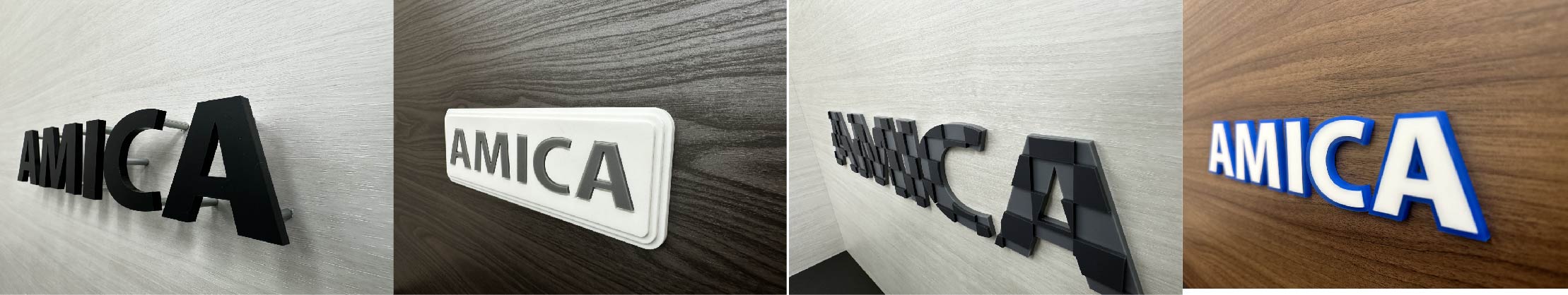 カラーアクリルもございますが、主に白・黒・透明が多く使われますが、表面や裏面にカッティングシートや装飾シート貼ったり塗装して色を表現します。裏面にボルト加工もできるので文字を浮かせた取り付けによりより立体感を出すこともできます。