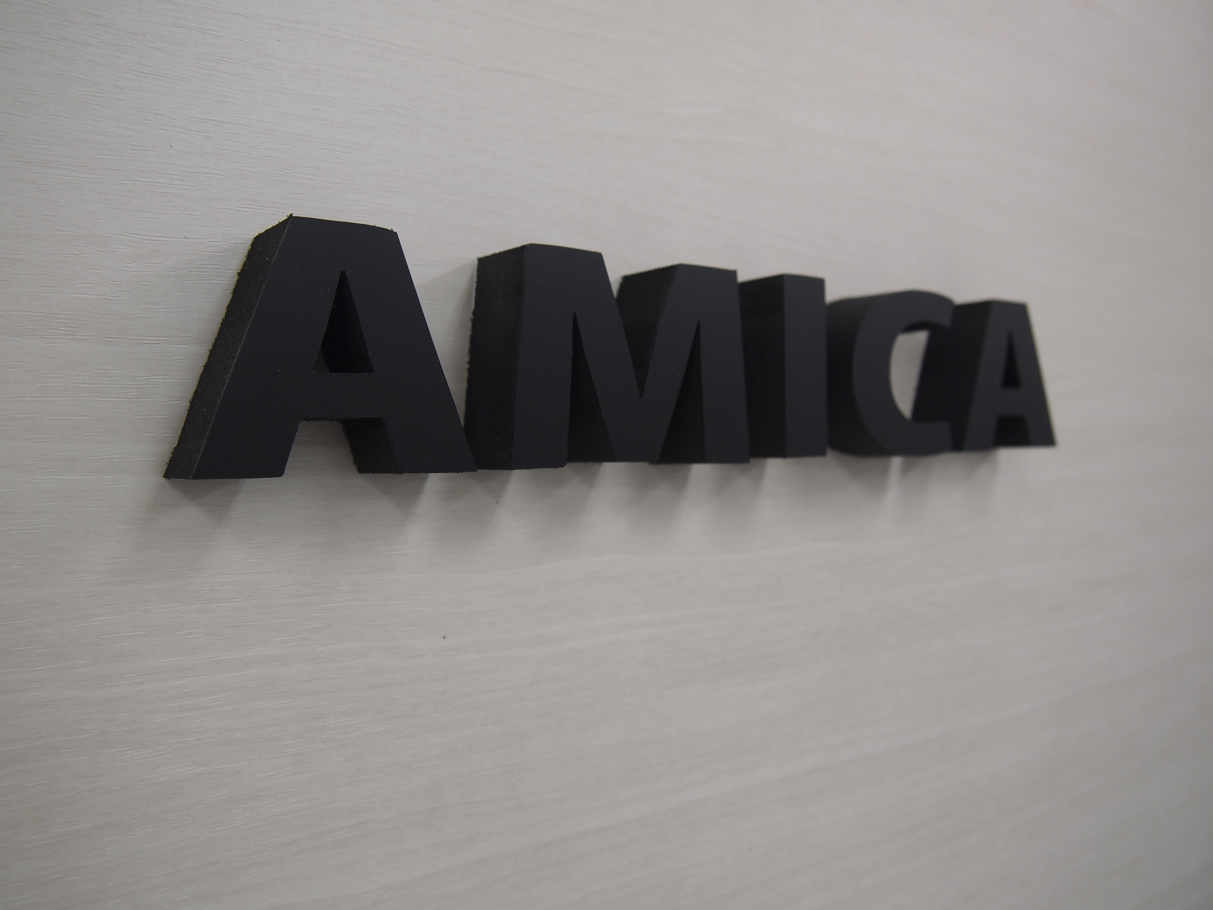 カラーアクリルもございますが、主に白・黒・透明が多く使われますが、表面や裏面にカッティングシートや装飾シート貼ったり塗装して色を表現します。裏面にボルト加工もできるので文字を浮かせた取り付けによりより立体感を出すこともできます。
